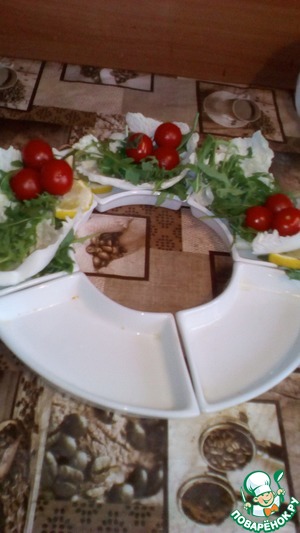 Начинаем наполнять сырным салатом порционные тарелочки. Сразу украшаем помидорками, лимончиком, крыжовником (можно использовать любые замороженные ягоды) и шишками из варенья.