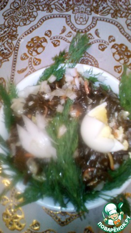 Добавляем морскую капусту. У меня есть рецепт на сайте маринованной морской капусты http://www.povarenok .ru/recipes/show/629 39/. Можете купить готовую. Если берёте маринованную капусту в банках, то жидкость слейте, даже лучше обсушить её салфеткой, чтобы салат не потёк.
