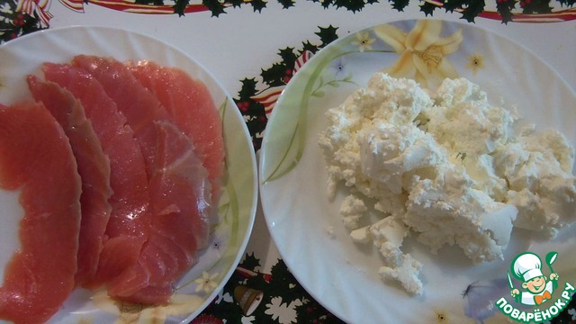 Испечённые блинчики (у меня получилось 5 штук) пусть остынут, а мы подготовим начинку. Я взяла слабо-солёную форель и творожный сливочный сыр (можно взять сыр с зеленью).