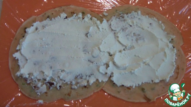 Остывшие блинчики я положила на пищевую плёнку, чтобы проще было сворачивать и заворачивать). Делаю сразу по два блинчика (в нахлёст, чтоб завернуть), намазываю сыр