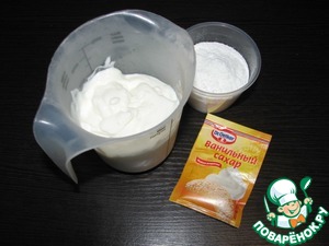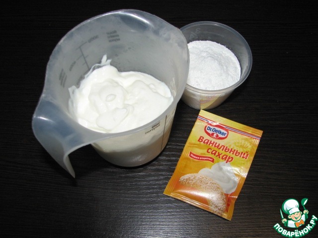 Подготовим продукты для крема: сметану, порошок для приготовления мороженого и ванильный сахар (ТМ Dr. Oetker).