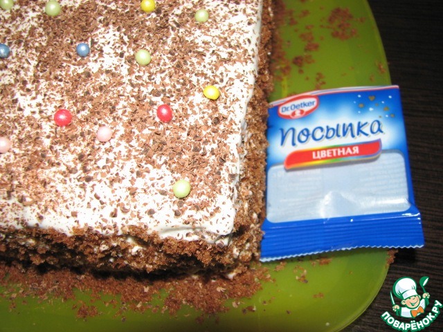 Я обсыпала бока крошкой из обрезков бисквита (пришлось немного подровнять коржи), верх посыпала тертым шоколадом и украсила кондитерской посыпкой TM Dr. Oetker.