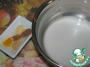 В другом сотейнике развести 1 ст. л. крахмала в 50 мл холодной воды. Добавить специи, размешать.