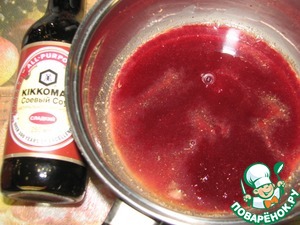 Сотейник поставить на огнь, влить ежевичное пюре, добавить соевый соус. Я использовала Сладкий соевый соус ТМ Киккоман.