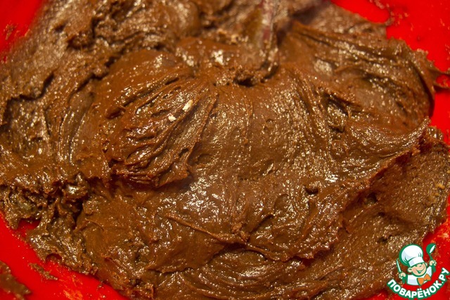Проверяем шоколад. Он уже стал теплым? Тогда добавляем его в яичную смесь и на небольших оборотах миксера смешиваем до однородности. Откладываем миксер в сторону, дальше будем работать ложкой или лопаткой. Частями добавляем сухие ингредиенты. Хорошо вымешиваем тесто (оно будет довольно густым), накрываем пищевой пленкой и хотя бы на 2 часа отправляем в холодильник, можно на ночь. На этом этапе консистенция может показаться жидковатой, но не спешите добавлять муку: в холодильнике масло и шоколад начнут застывать и она станет гуще. Я добавила немного муки уже непосредственно перед формовкой