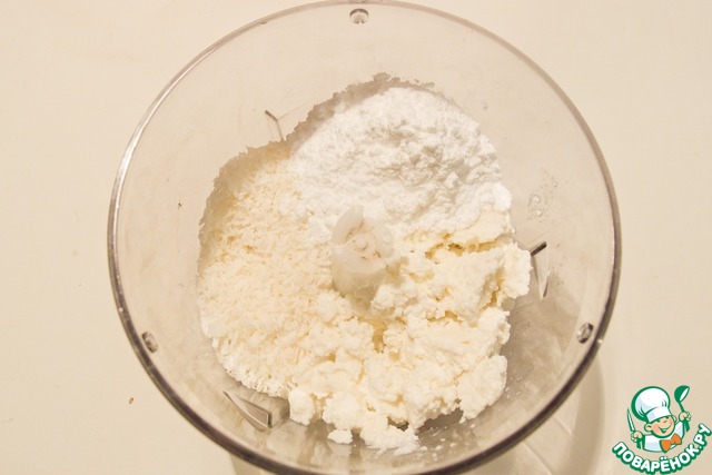 За полчаса до начала формовки подготавливаем начинку. Пропорции тут будут сильно зависеть от ваших предпочтений. Мне хотелось умеренно сладкого и творожного-творожного. Поэтому в моем ансамбле рикотта солирует.