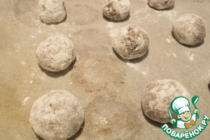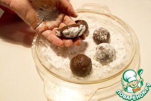 Аккуратно защипываем края и обмакиваем их в сахарной пудре, чтобы они легче лепились. Скатываем шарик и кладем его в тарелку с сахарной пудрой.