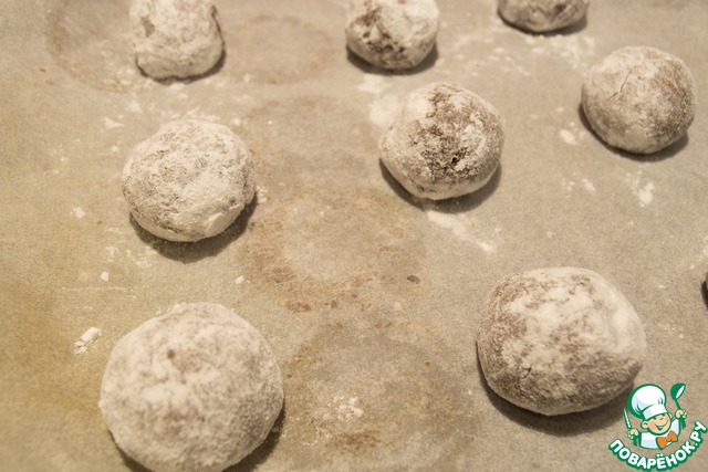 Перед тем как поместить шарики на противень, хорошо-хорошо обкатайте их в сахарной пудре. Я пробовала это делать сразу. Но в тот момент, когда последнее печенье ложиться на лист, пудра на первых успевает размокнуть и впитаться. В итоге печенье получается равномерно коричневом со следами растаявшего снега