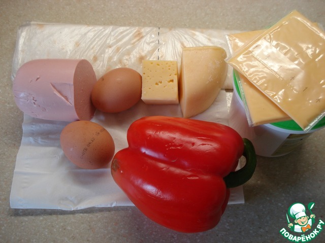 Простой рулет из лаваша с колбаской, сыром, яйцом и болгарским перцем.