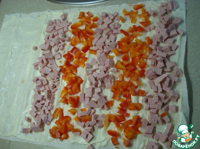 Колбасу и болгарский перец нарезаем мелкими кубиками. Раскладываем полосами на смазанный майонезом лист лаваша.