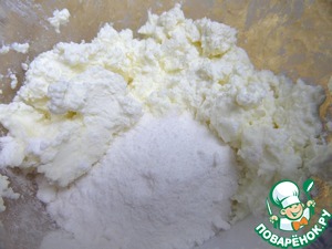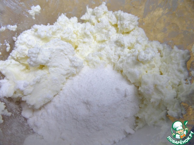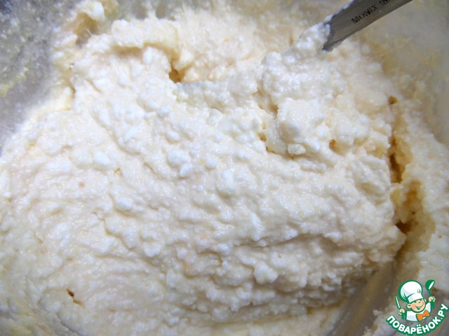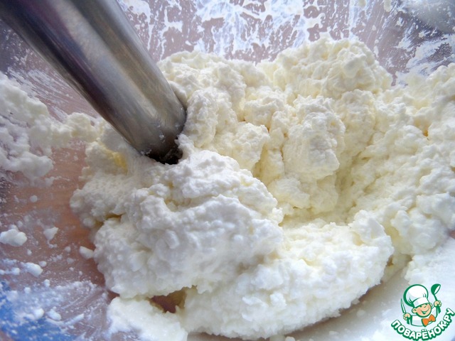 Для начинки творог лучше брать пачечный. Если он крупинками, как у меня, то пробить блендером. У меня обезжиренный.