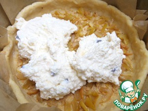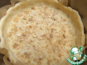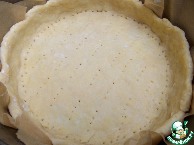 Тесто размять по съёмной форме (диаметр 21 см) с пергаментом, который смазать маслом без запаха. Бортики обязательно. Дно наколоть вилкой.
