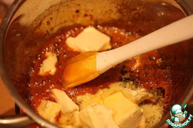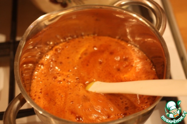 Как только сахар расплавился, добавить ЧАСТЯМИ ГОРЯЧУЮ ВОДУ.