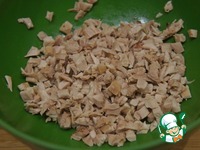 Отварить мясо с добавлением луковицы и стеблей укропа. Охладить в бульоне.
