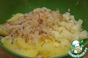 Лук измельчить, обжарить до золотистого цвета и добавить к мясу с картофелем. Все тщательно перемешать.