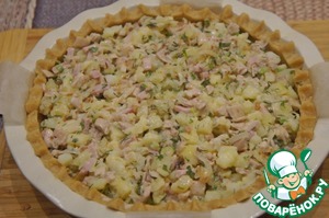 Форму d 20-23 см смазать маслом. Распределить тесто, оформив высокий бортик. Выложить начинку, сверху равномерно полить заправкой.