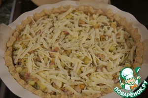 Выпекать при 180*С 30 минут. Затем вытащить форму, слегка присыпать пирог тертым сыром и снова отправить в духовку. Выпекать до готовности.