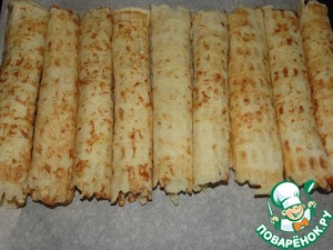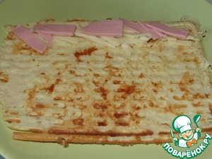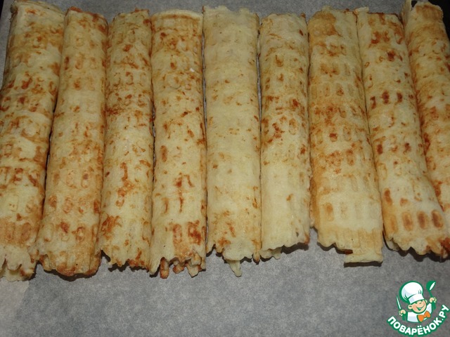 Выкладываем все вафли на поднос и ставим в духовку. На 5-8 минут при температуре 200 гр. Они будут более хрустящие, а сыр расплавится.