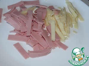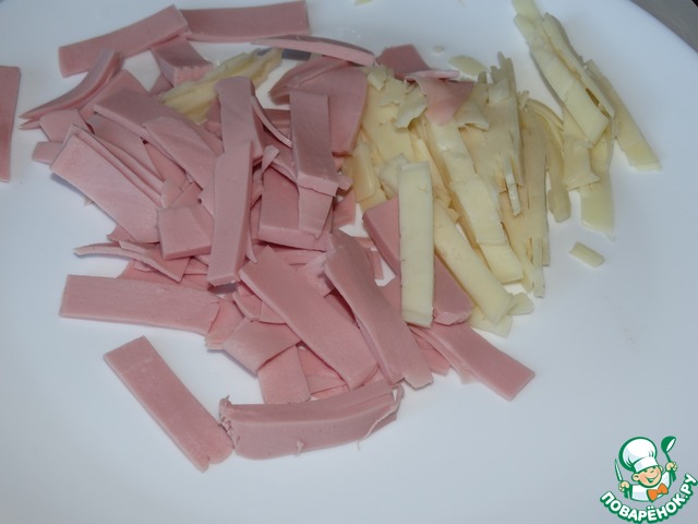 Подготавливаем начинку, мелко нарезаем колбаску и сыр.