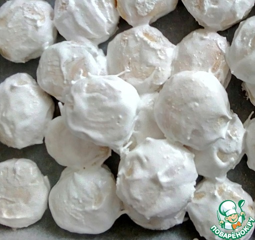 Приготовим глазурь. Охлажденные белки надо взбить до устойчивых пиков, затем не большими порциями добавлять сахар и взбивать до полного его растворения. Готовая глазурь должна быть гладкой и блестящей.