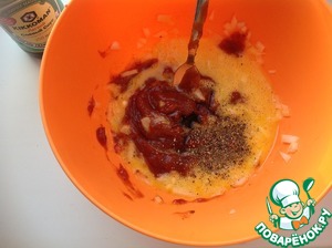 В миску добавить яйца, кетчуп, соевый соус (у меня легкий соус ТМ Киккоман), черный перец. Все перемешать вилкой.