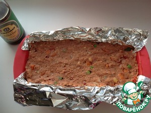 Выложить в форму фарш, утрамбовать и разровнять. Прикрыть сверху фольгой.