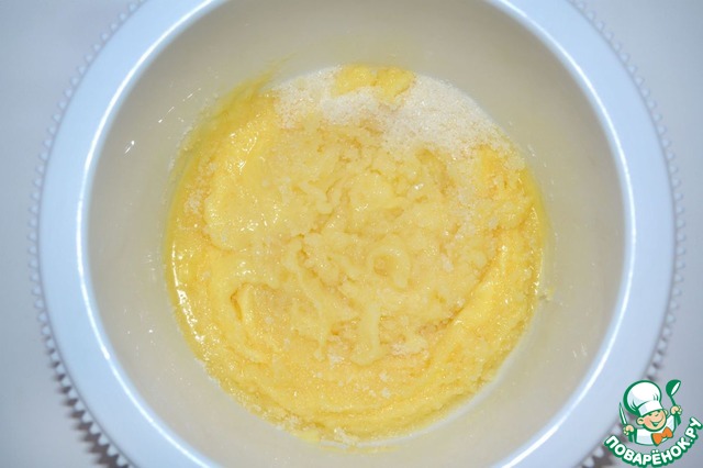 Сливочное масло взбить миксером с сахаром до его полного растворения.