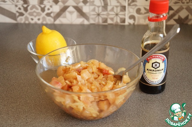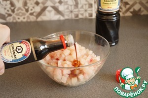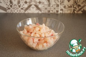 Рыбу нарезать на полоски, затем полоски на кубики.