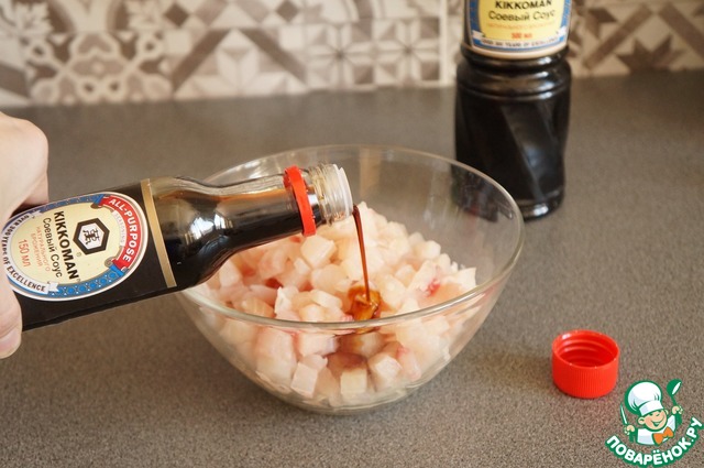 Влить к рыбе соевый соус.