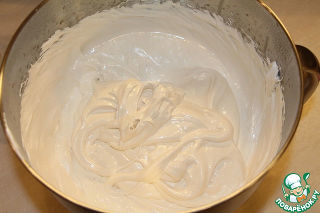 Вылить желатин в чашу миксера и начать потихоньку взбивать. Когда сироп готов и перестал бурлить, взбить желатин на максимальной скорости и тоооонкой струйкой вливать сироп. Взбивать массу до увеличения в объеме примерно в два раза и загустения. Важно хорошо взбить массу и не перебить ( должны оставаться следы от венчика, как на фото).