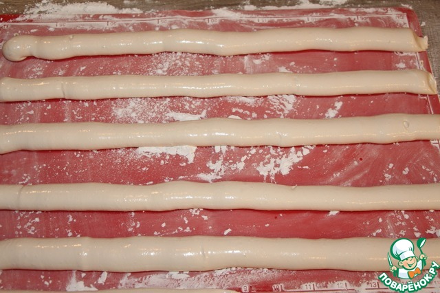 Смешать сахарную пудру и крахмал в отдельной емкости. Силиконовый коврик или пекарскую бумагу хорошо подпылить смесью из пудры и крахмала. Переложить массу в кондитерский мешок, отрезать кончик мешка по желаемому размеру маршмеллоу и отсадить длинные колбаски на коврик.