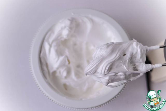 В чистой обезжиренной кастрюльке смешать белки с сахаром, ванильным сахаром и лимонной кислотой. Взбить миксером до консистенции мыльных пузырей.