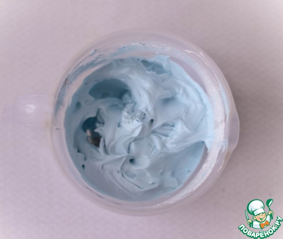 Разделить крем на 2 части, в одну добавить синий и каплю черного красителя, перемешать.