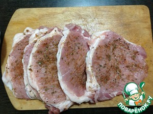 Свинину обмыть, обсушить и нарезать порционными кусками. Слегка отбить.