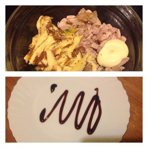 Отварную курочку нарезать маленьким кубиком, яичный блин-соломкой. Салат перемешать.