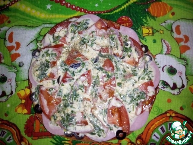 Наносим тонким слоем томатную пасту или соус на срез лепёшки. Затем накладывает то, то есть в холодильнике: колбаса, помидор, маслины и т. д.... что любите.