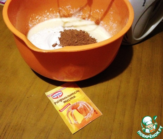 Добавить просеянную с разрыхлителем муку, какао-порошок.