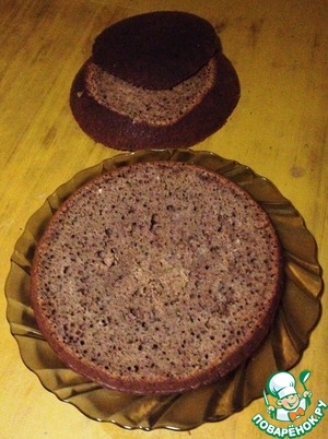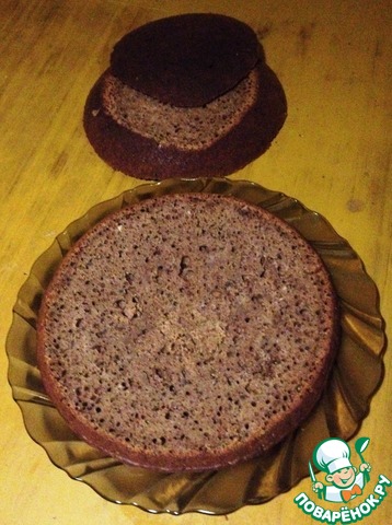 Готовый бисквит перевернуть с помощью вкладки для варки на пару и вытащить из чаши. Остудить на решётке. Охлаждённый бисквит разрезать на три части.