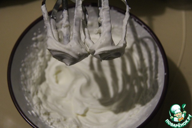 В остывшую желтковую массу ввести взбитые сливки и перемешать. Затем добавить взбитые белки и еще раз аккуратно перемешать венчиком, движениями сверху вниз.