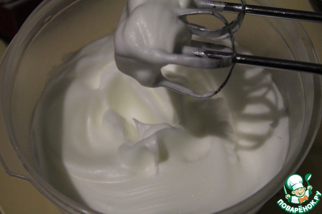 Не прекращая взбивать, влить отжатый лимонный сок и яблочный сок с желатином. Взбивать до получения светлой пышной массы. Отставить.