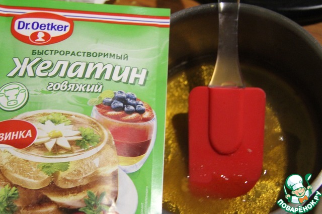 Желатин залить холодной водой (как указано на упаковке). Яблочный сок в небольшой кастрюле довести до кипения, снять с огня, добавить желатин и перемешивать, пока он полностью не растворится.