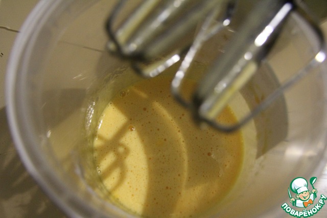Желтки отделить от белков и взбить миксером. Добавить 1 ст. л. сахарной пудры и еще немного взбить.