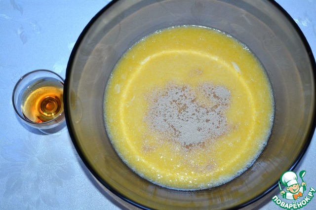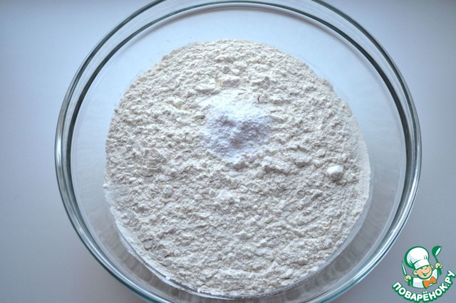 Муку смешать с разрыхлителем, просеять и добавить к жидкой части.