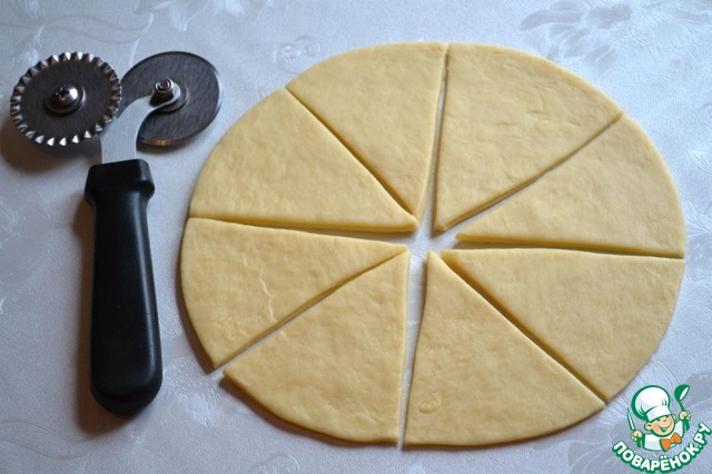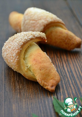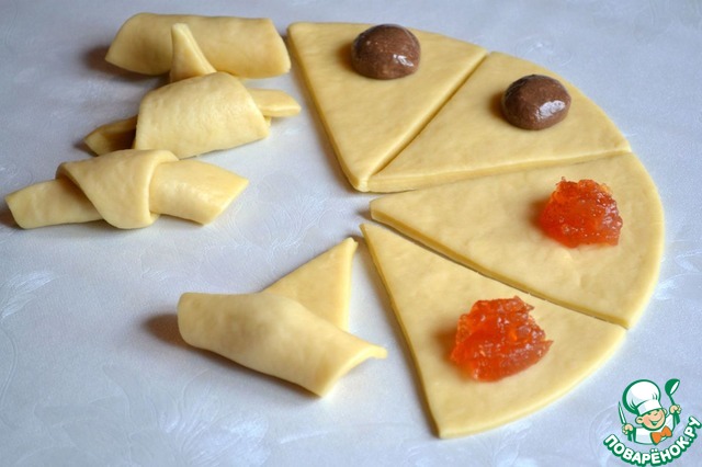 Свернуть рулетом по направлению к узкому концу. Можно каждый рогалик обкатать в сахаре.