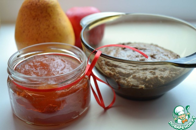 Для начинки подготовить яблочно-грушовое повидло и халву (у меня шоколадная). Халву размять вилкой, добавив или немного повидла, или 50 г сливочного масла, для того, чтобы масса стала однородной.