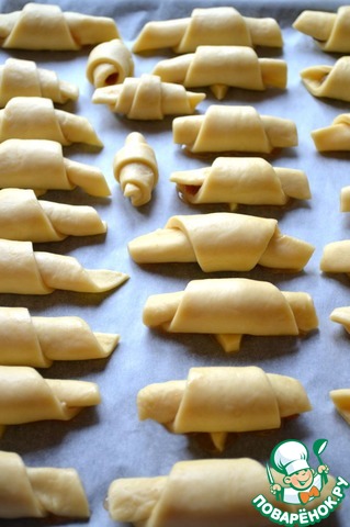 На застеленный пекарской бумагой противень выложить рогалики. Дать подойти минут 15.