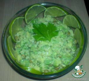Салат готов. )) Очень приятный вкус, больше всего чувствуется авокадо, риса должно быть меньше. А сельдерей с горошком придают интересный оттенок.