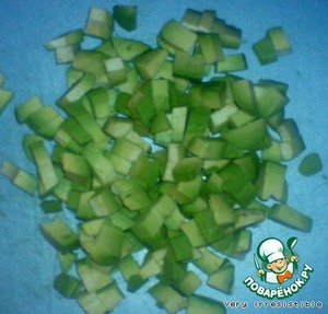 Авокадо очищаем от кожуры, разрезаем пополам, достаем косточку и нарезаем кубиками.