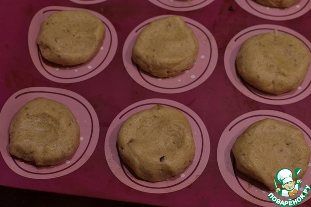 Положить на противень силиконовый коврик, тесто разделить на 20 шариков, выложить на коврик и слегка приплюснуть. Выыпекать при 180 град 20-25 мин. в зависимости от вашей духовки