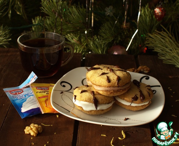 Основой для сэндвича служит ореховое рассыпчатое печенье- а начинкой-ваше любимое мороженое. Рецепт хорош тем, что мороженое не сильно заморожено, а загущено и охлаждено в холодильнике. Опытным путем было установлено, что не на всяком мороженом загуститель работает! Уж не знаю, с чем это связано. Так что будьте осторожны. Конечно, можно не заморачиваться, а просто проложить печенки мороженым, но если вам не повезло, как мне, и перед праздниками заболело горло-то это выход!
